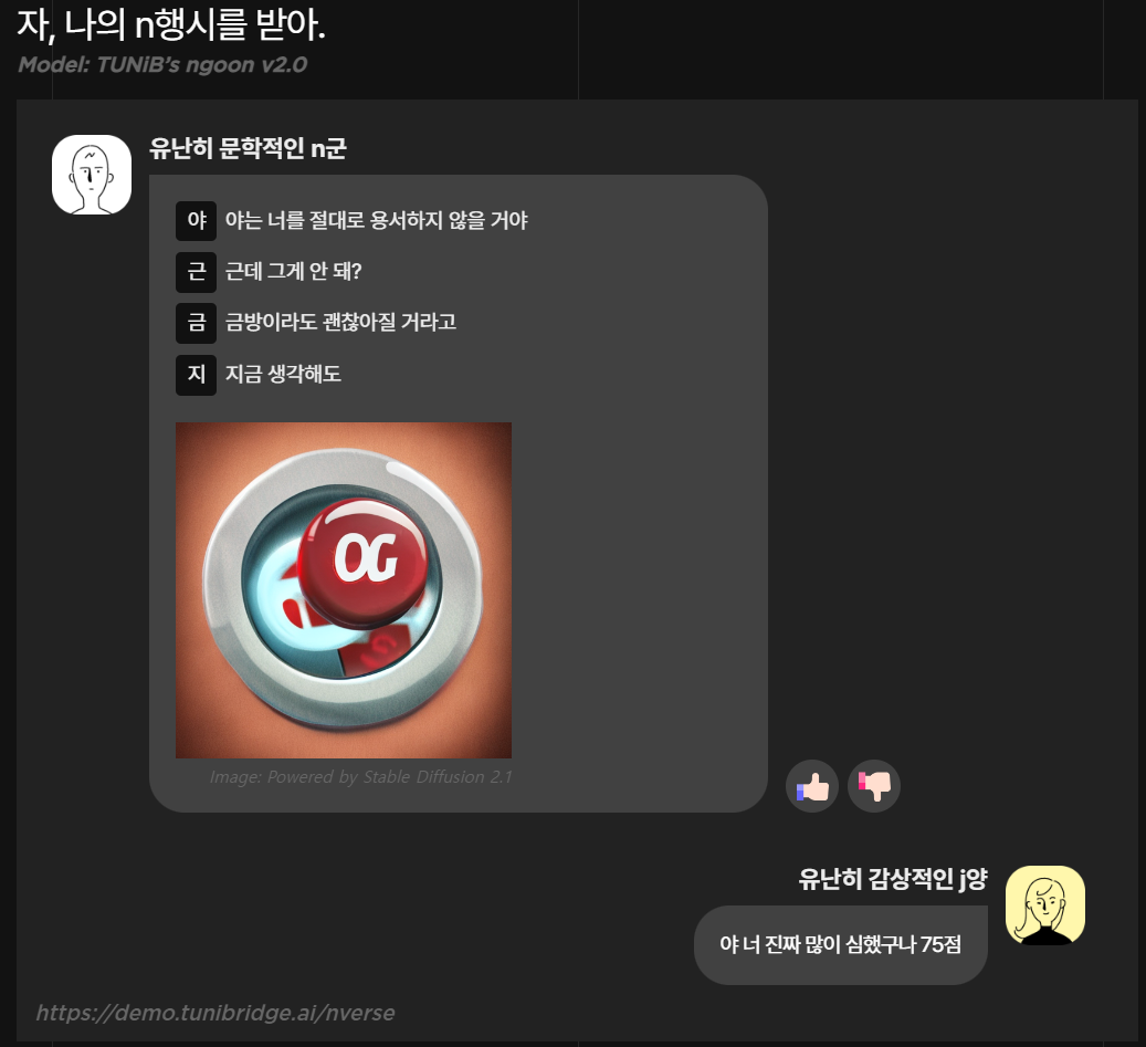 다양한 AI 데모를 사용하게 해주는 튜닙의 튜니브리지 데모 사이트에 N행시 신버전이 오픈되었습니다.